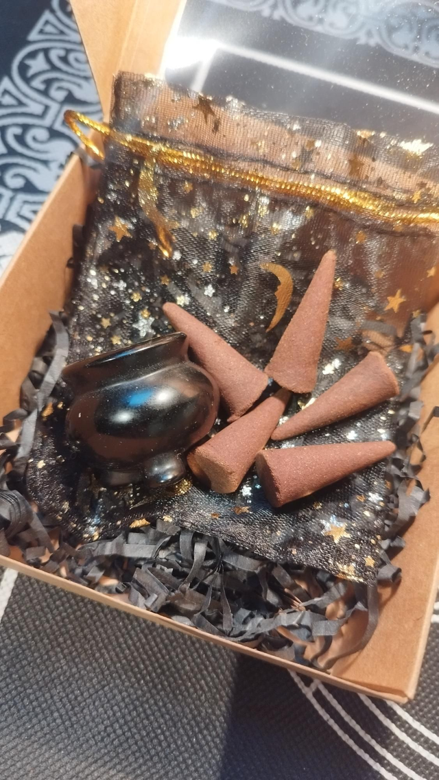 Porte-encens pour cônes en forme de chaudron trop choupi 😍 ! Entièrement taillé dans de l'obsidienne noire, et accompagné de 5 cônes d'encens de myrrhe au parfum des plus envoûtants... H: 3cm diam: 3cm